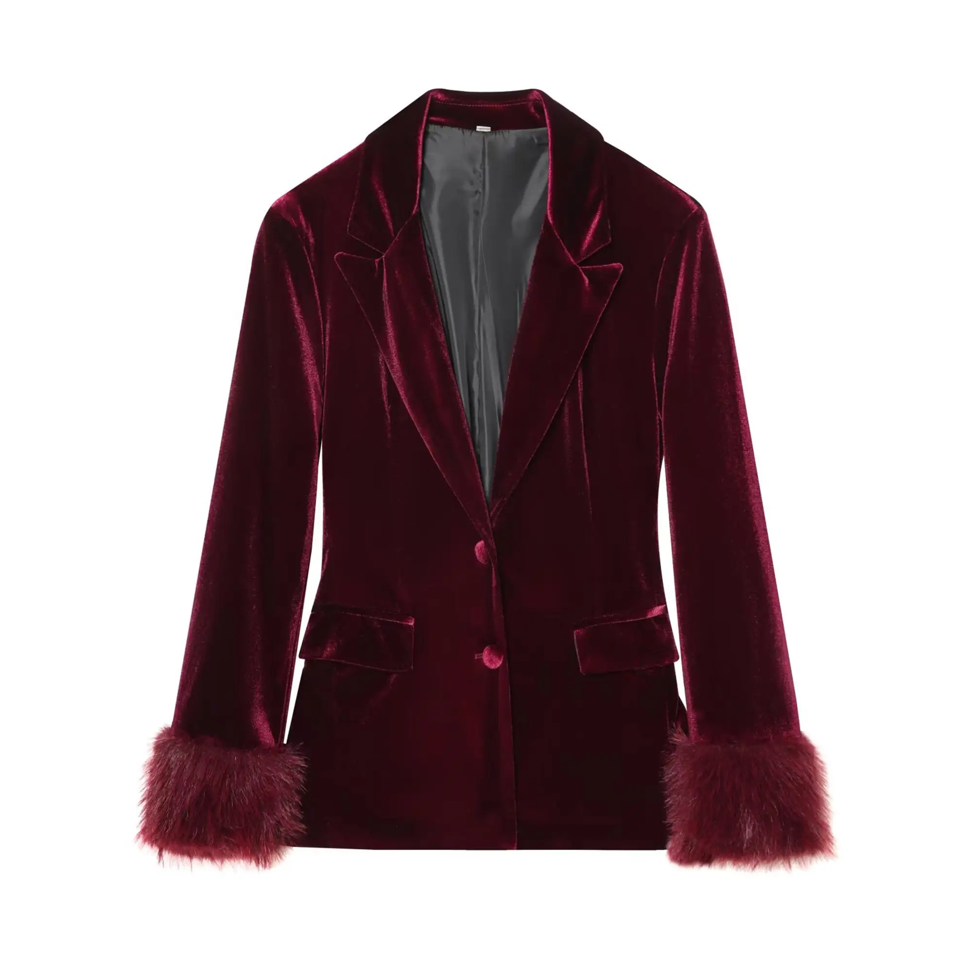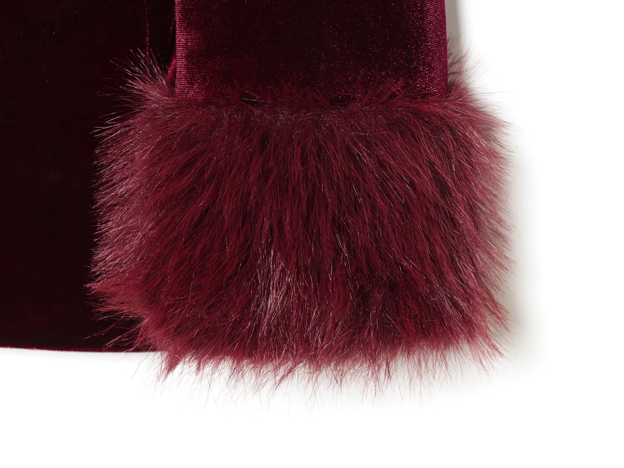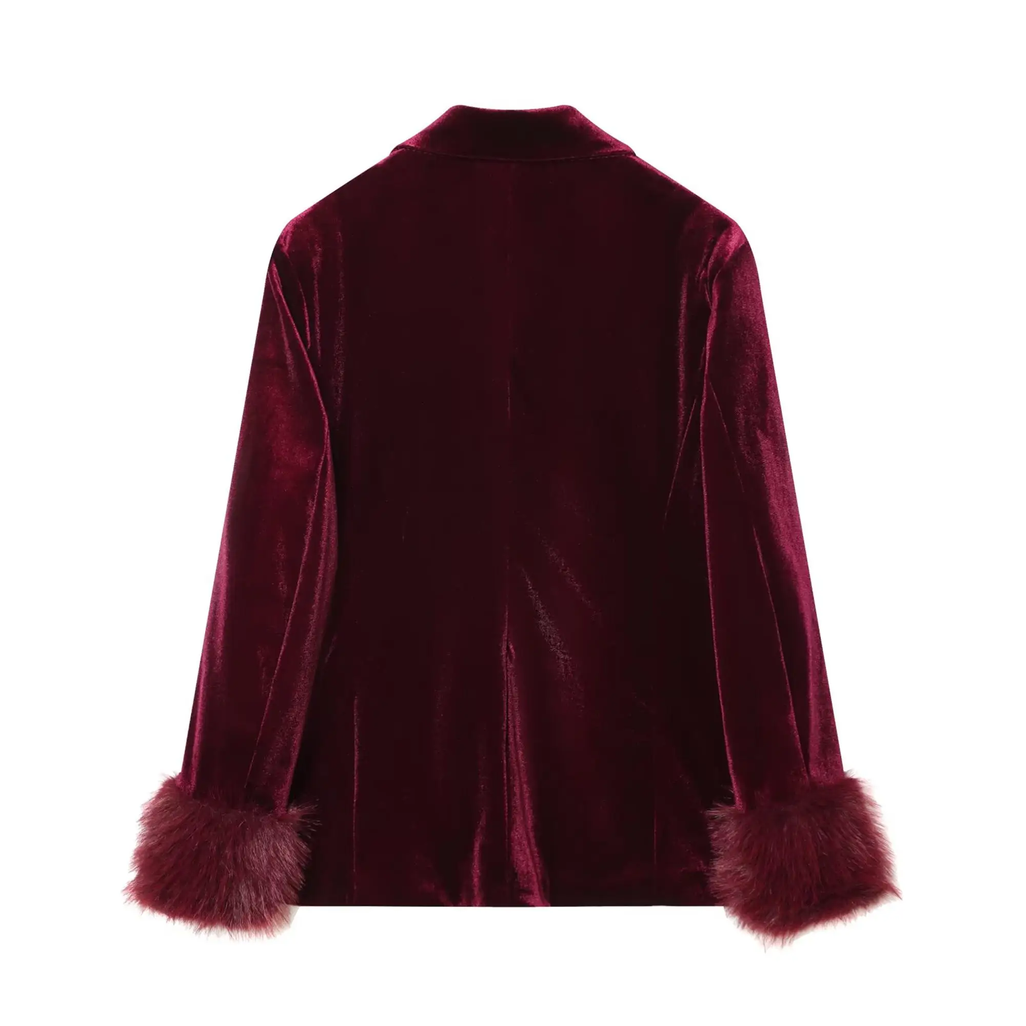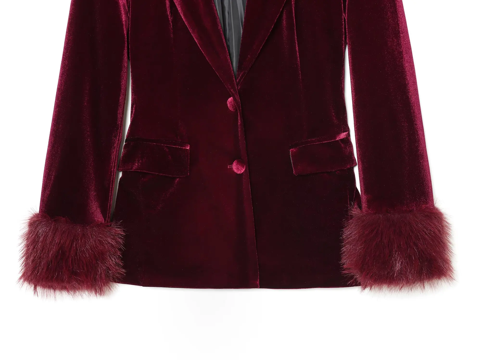 This refined two-piece set pairs a tailored V-neck blazer with soft faux fur accents and wide-leg trousers, all crafted from a rich velvet-touch performance fiber blend—ideal for upscale winter occasions or chic holiday dressing.