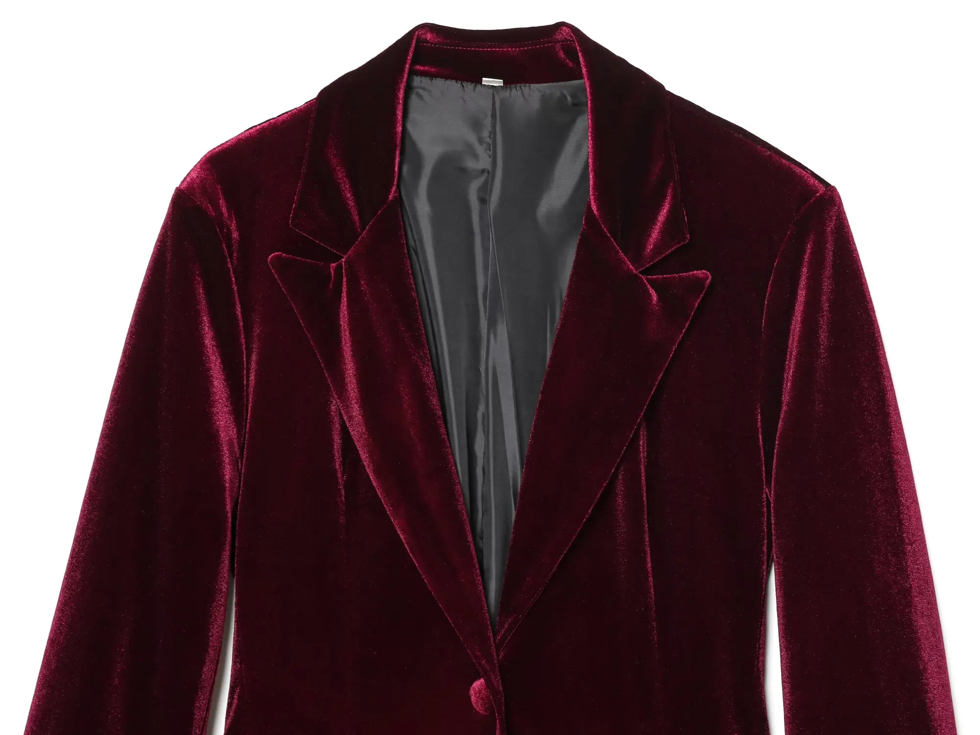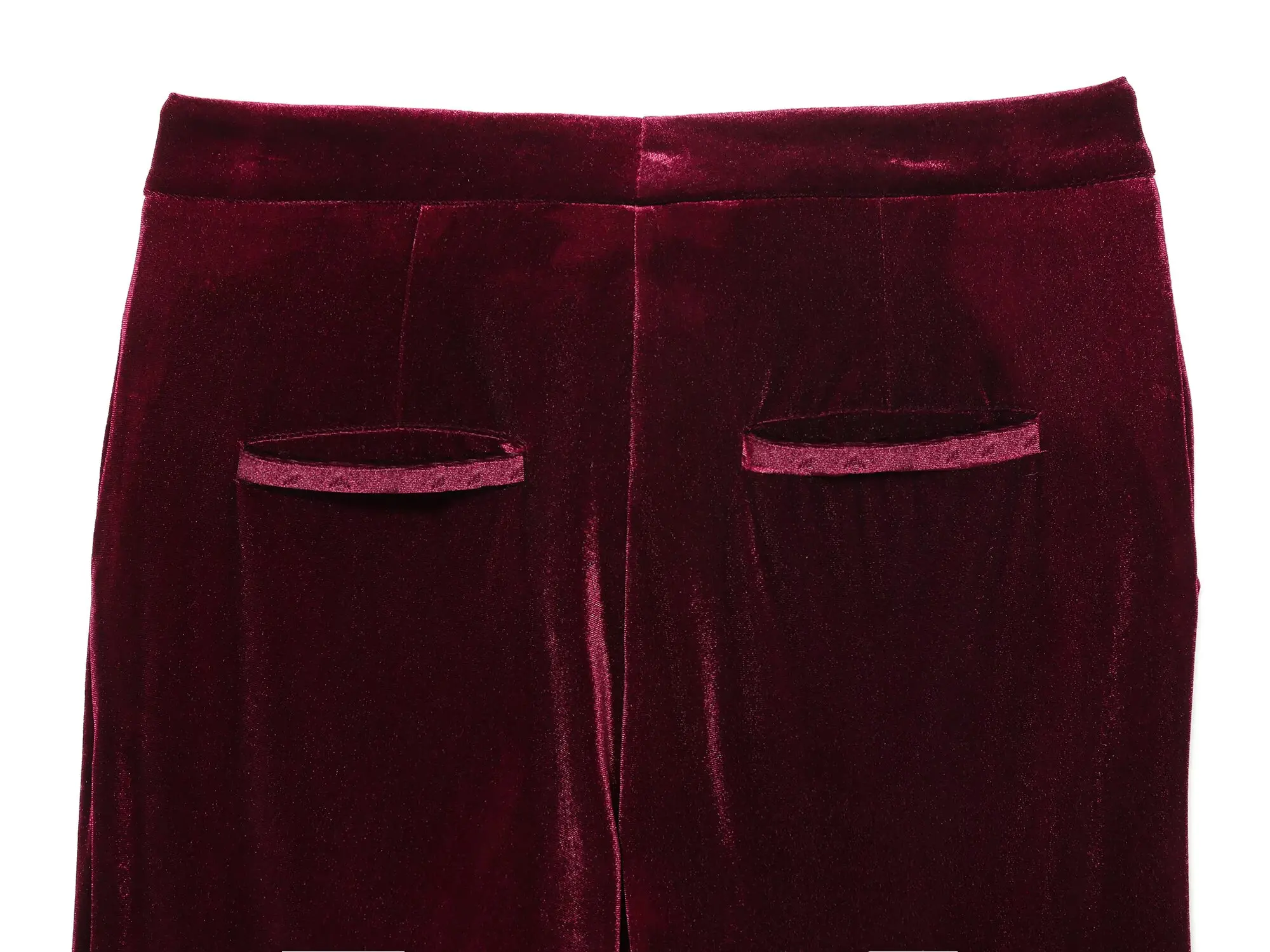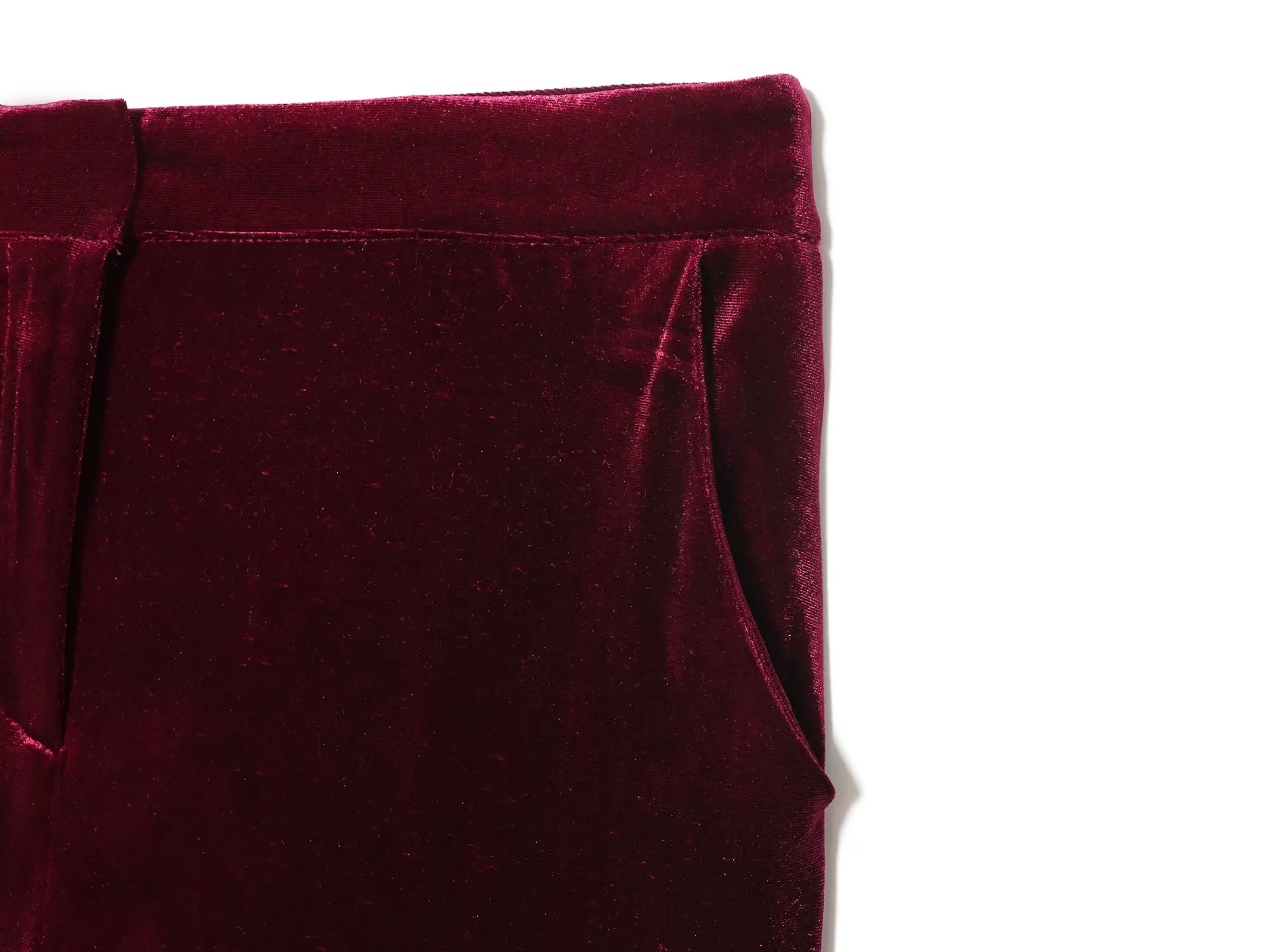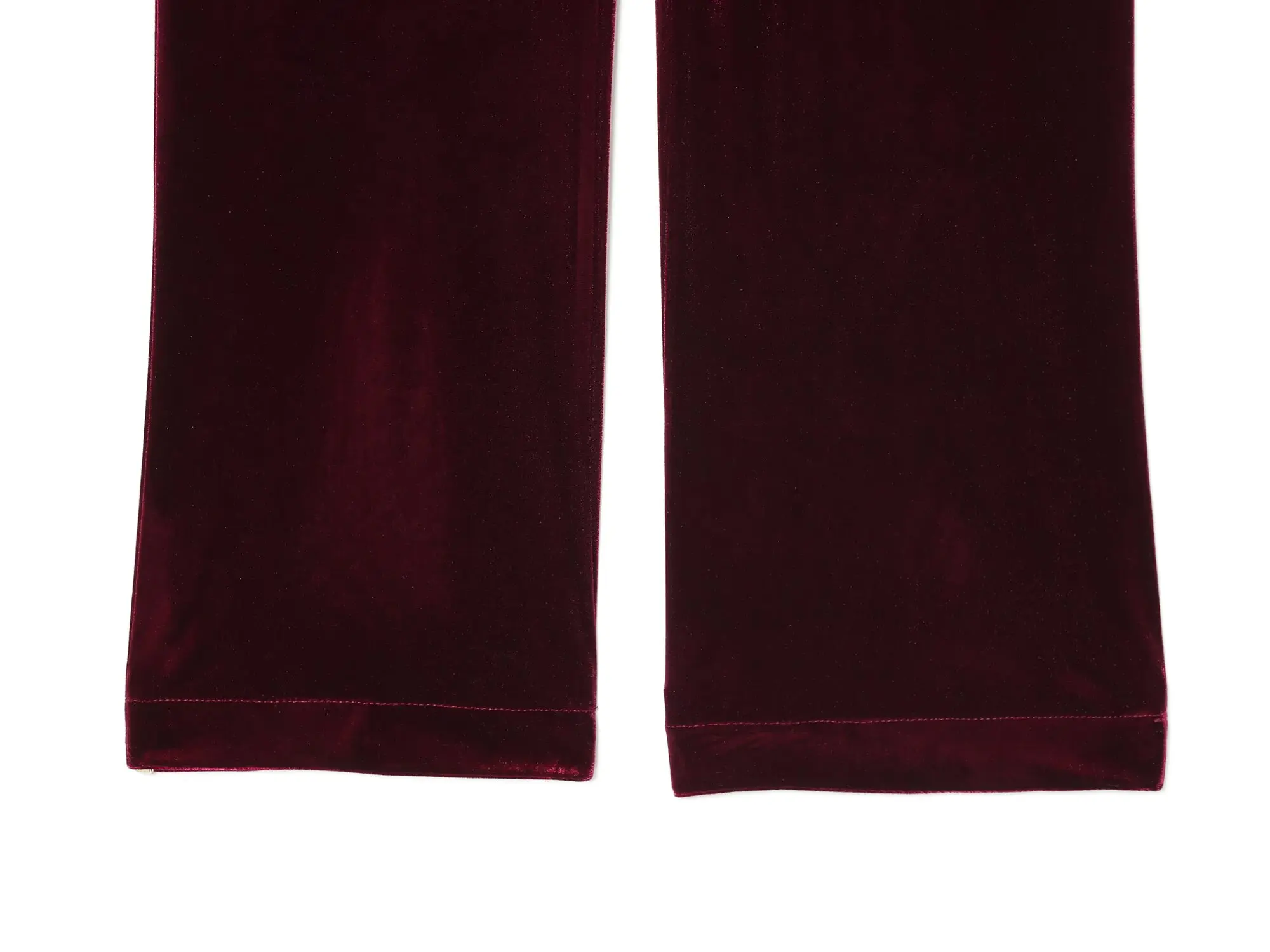 This refined two-piece set pairs a tailored V-neck blazer with soft faux fur accents and wide-leg trousers, all crafted from a rich velvet-touch performance fiber blend—ideal for upscale winter occasions or chic holiday dressing.