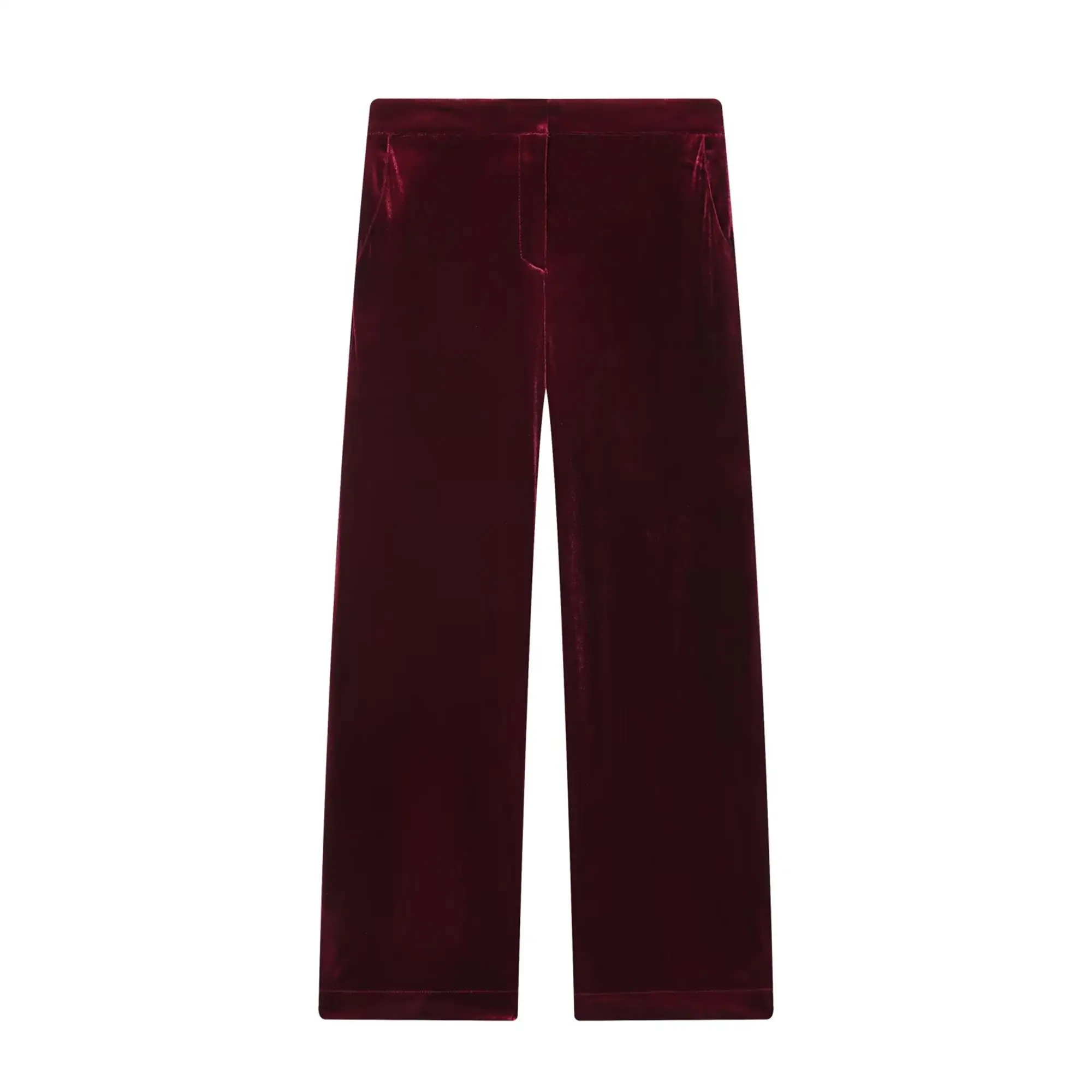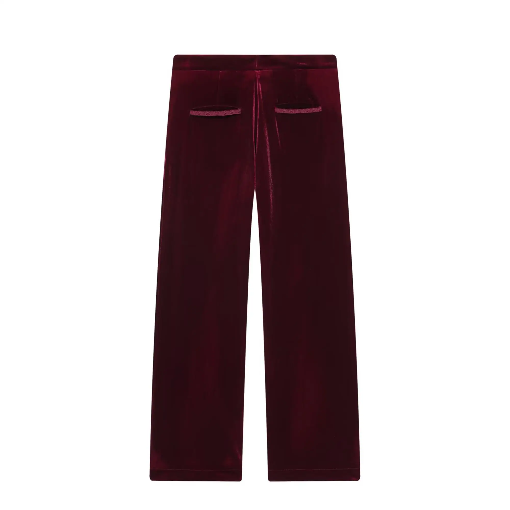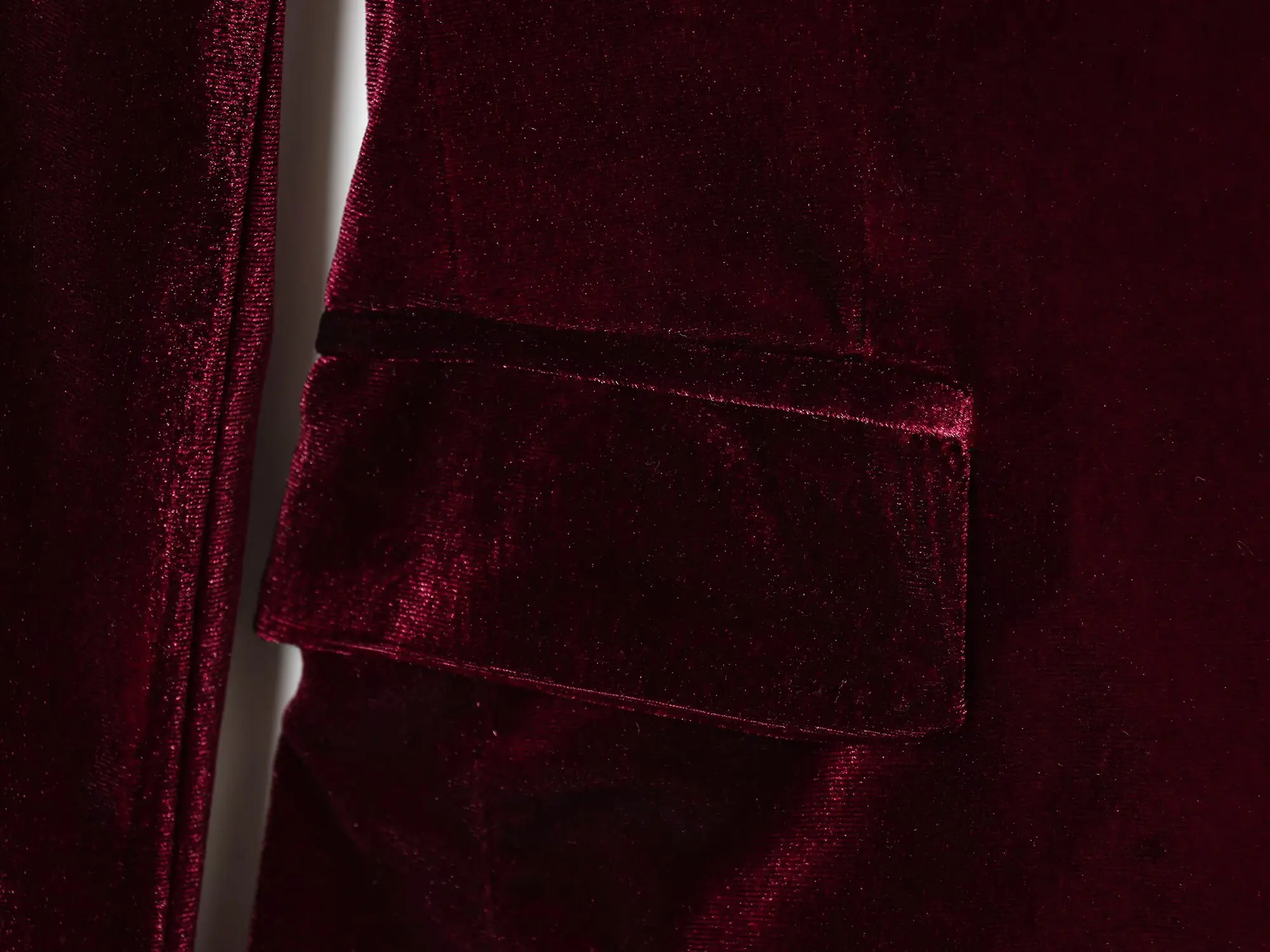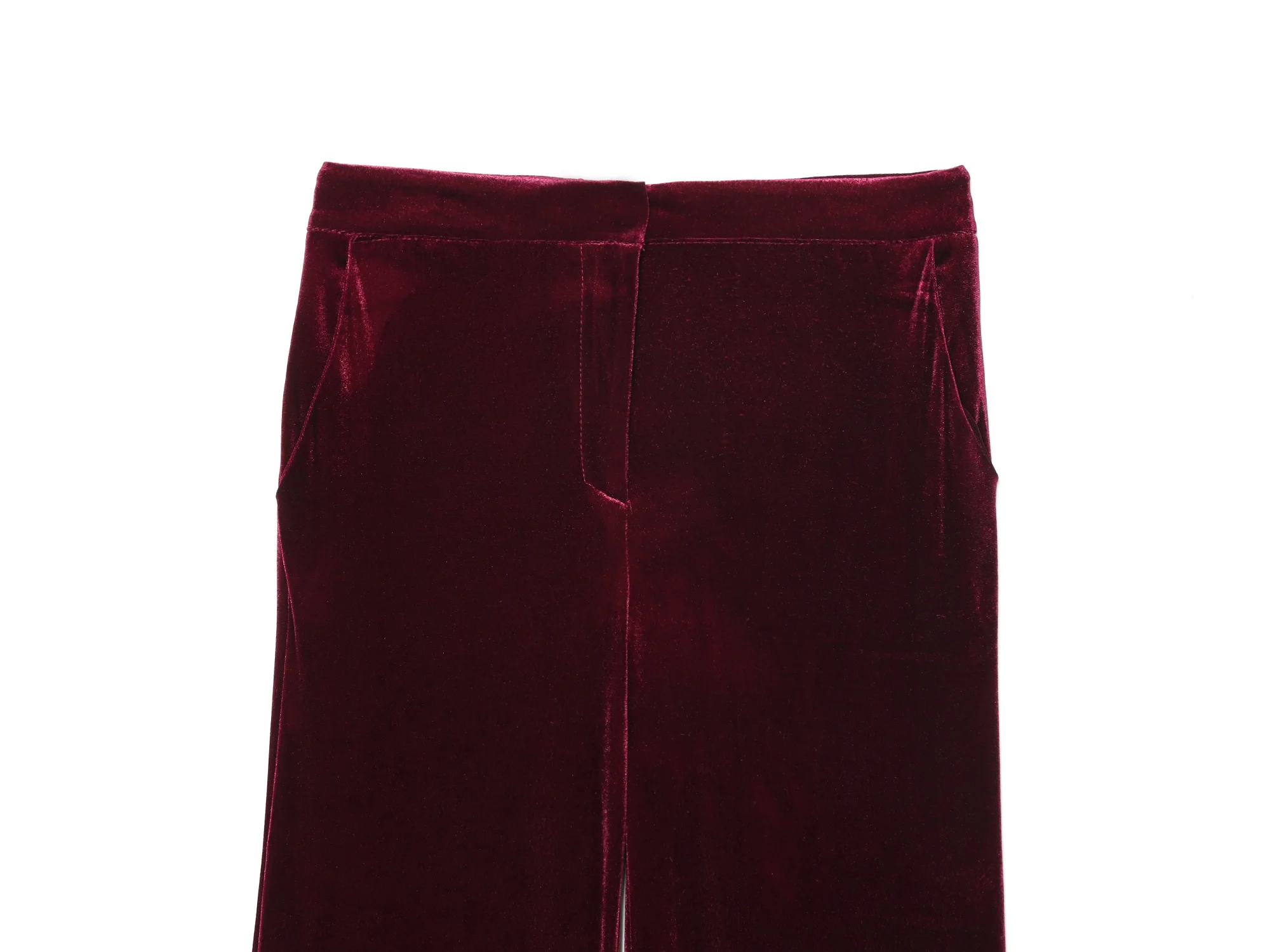 This refined two-piece set pairs a tailored V-neck blazer with soft faux fur accents and wide-leg trousers, all crafted from a rich velvet-touch performance fiber blend—ideal for upscale winter occasions or chic holiday dressing.