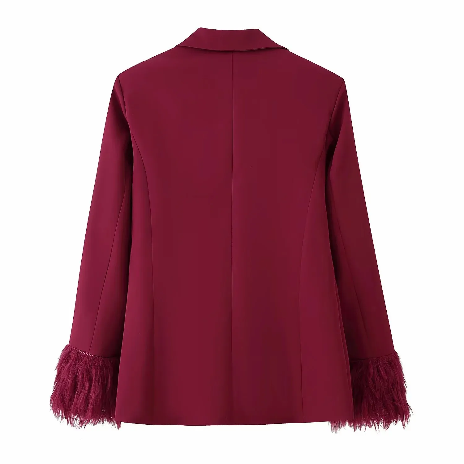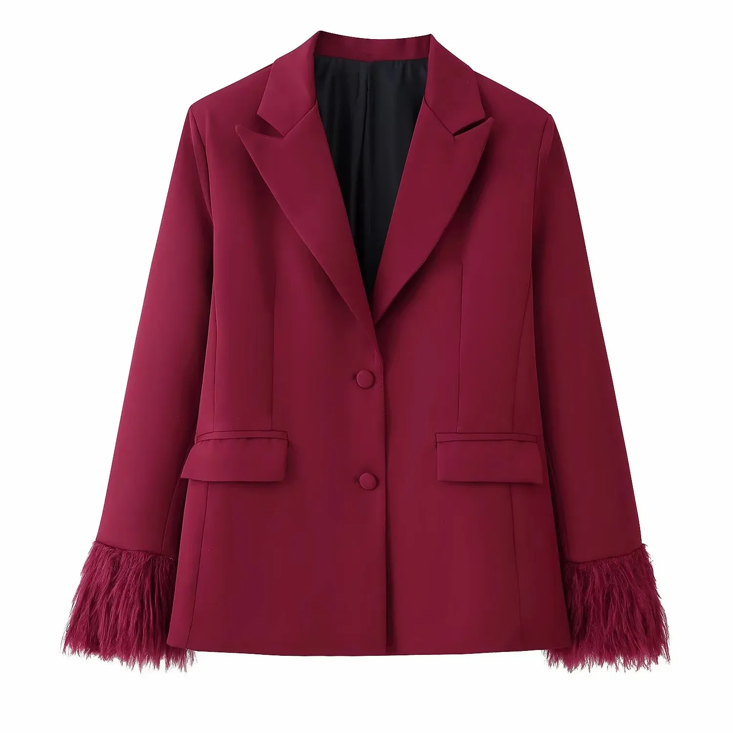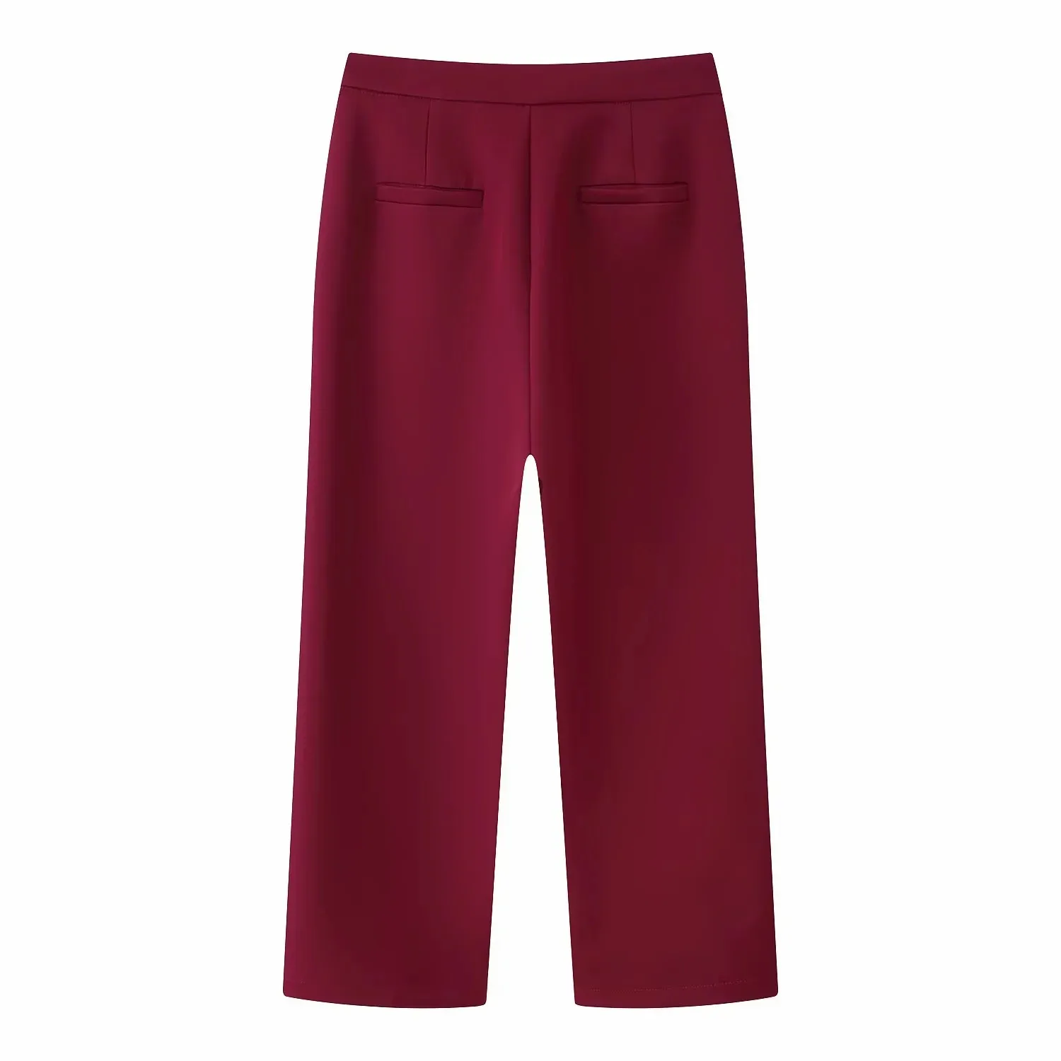 Dieser elegante Damenanzug besteht aus einem Blazer mit strukturiertem Revers und einer dazu passenden, weit geschnittenen Hose. Gefertigt aus glattem Webstoff, verleiht er einen selbstbewussten und eleganten Look, perfekt für Herbst und Winter.