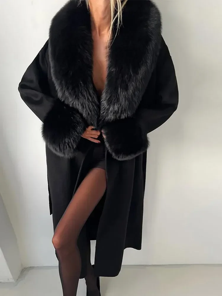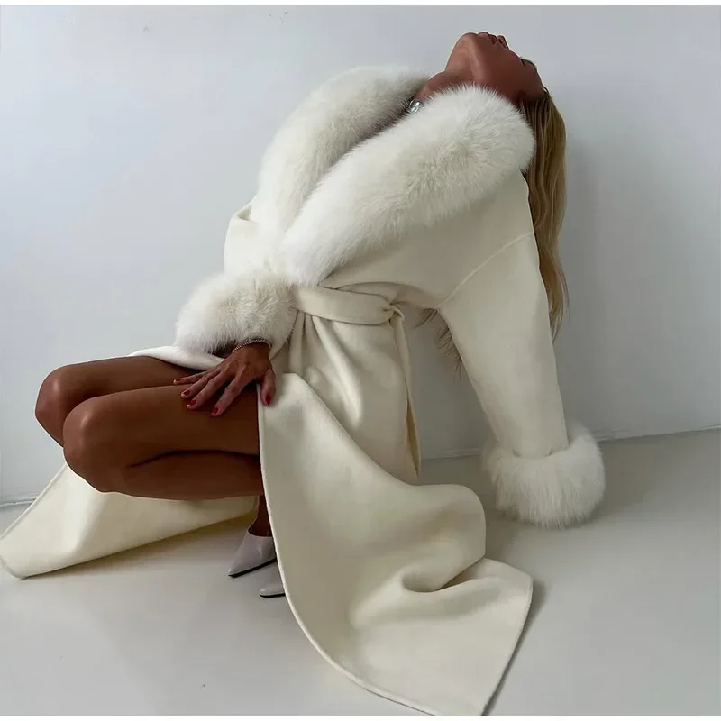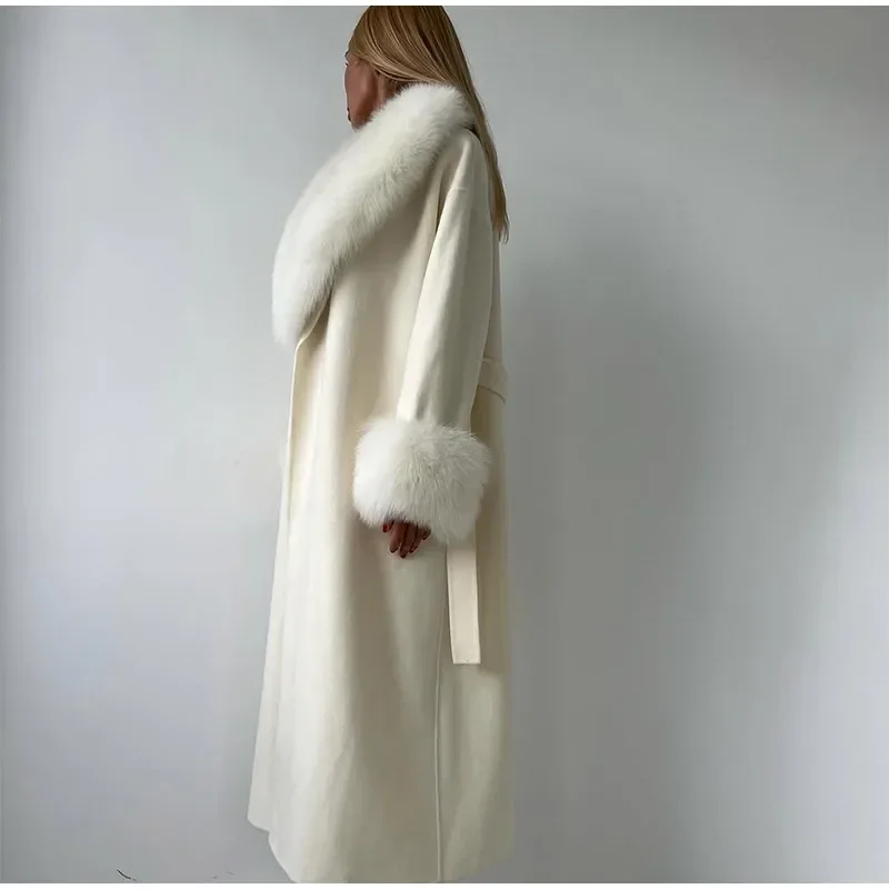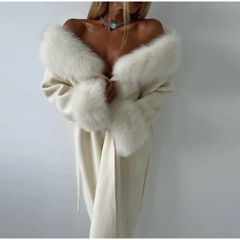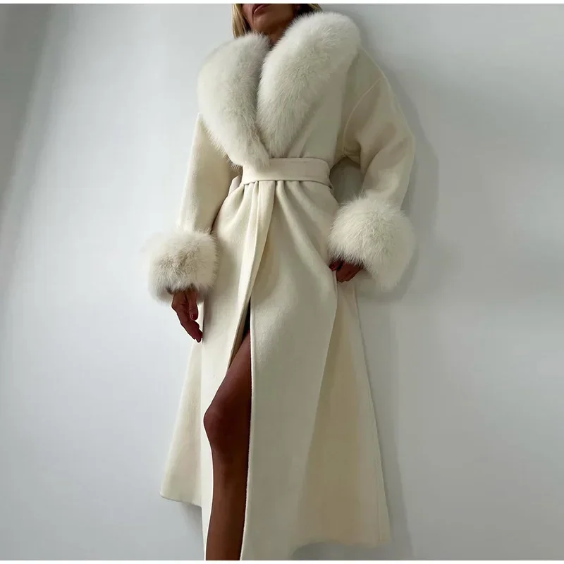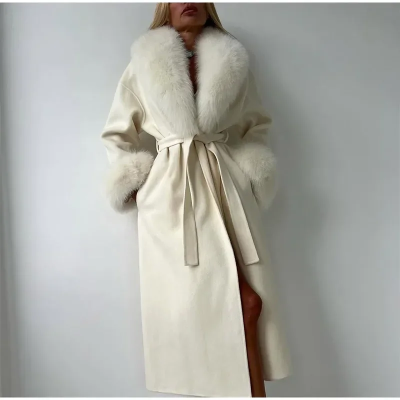 This cream - colored long coat is a vision of luxury and sophistication. The plush, white fur collar and cuffs add an indulgent touch, making it a statement piece for colder days. The long length provides excellent coverage, keeping you warm and cozy.The belt allows you to cinch the waist, creating a flattering silhouette. Whether you're attending a fancy event, going on a winter date, or simply strolling through the city, this coat is sure to turn heads. Pair it with some elegant heels and minimal jewelry to complete the look. It's a must - have for anyone who wants to exude elegance and style during the winter months.