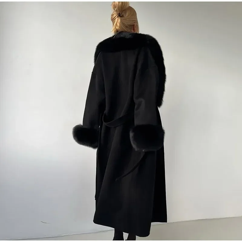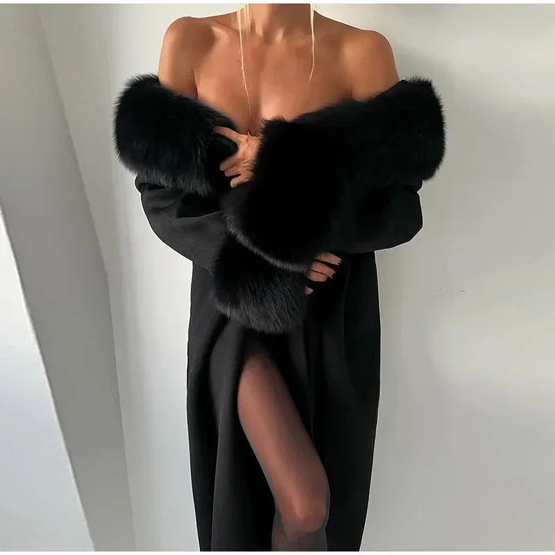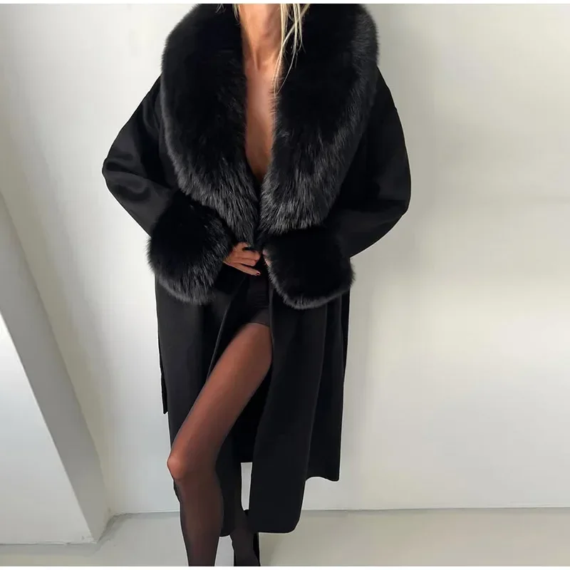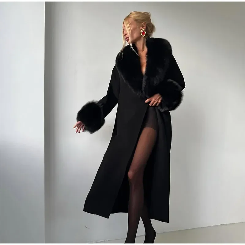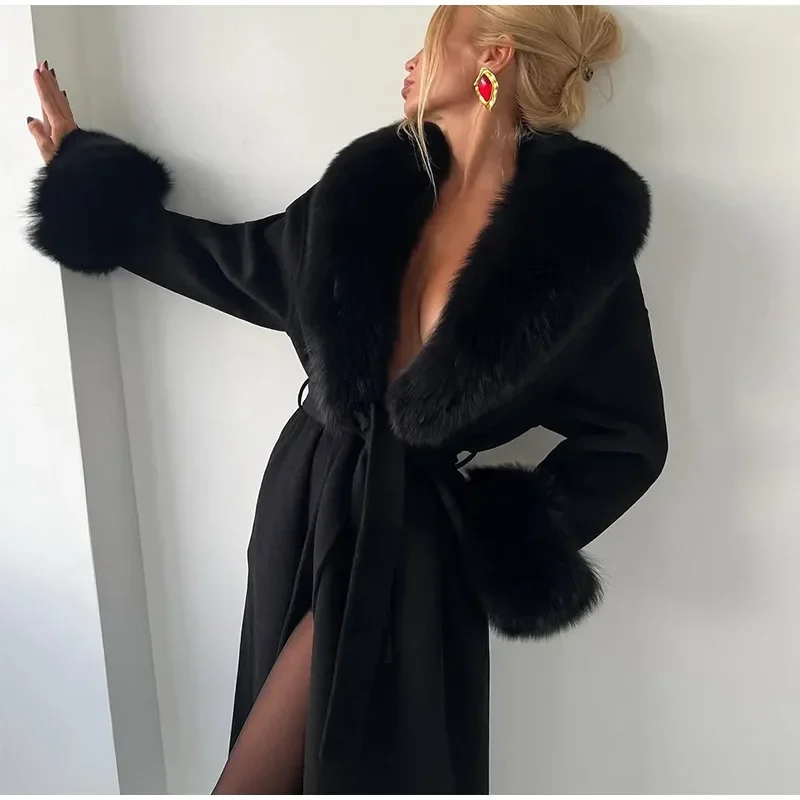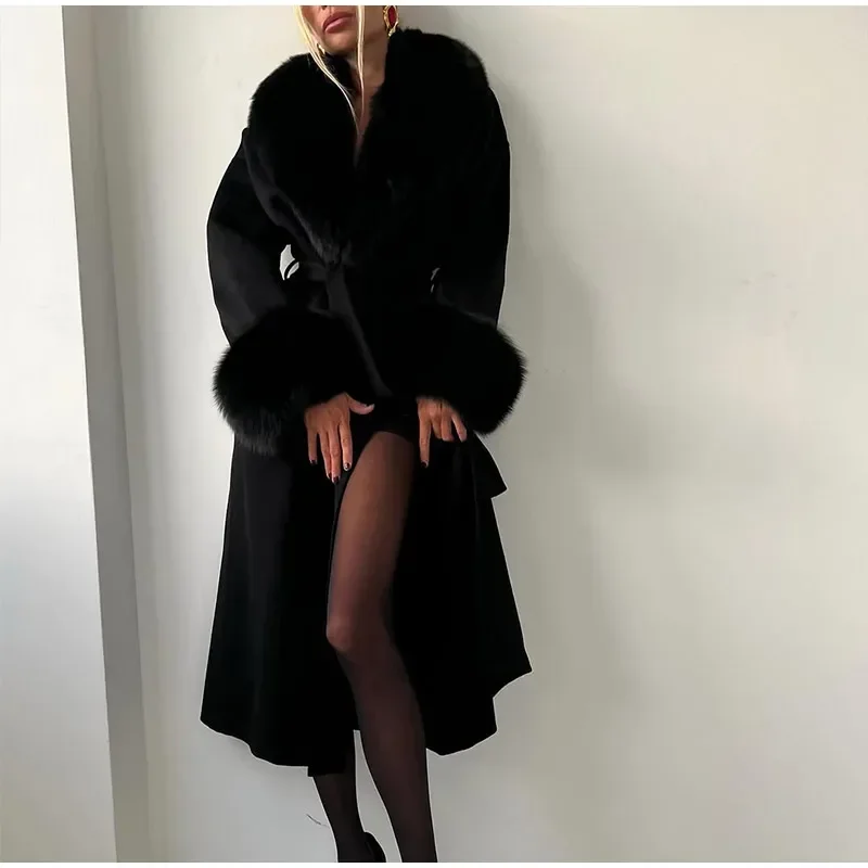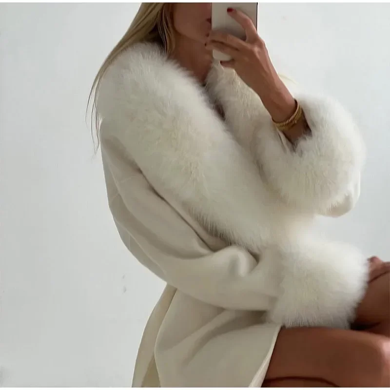 This off - white long coat is so luxurious! The large fur collar and the fluffy design on the cuffs not only provide super warmth but also instantly enhance the overall sense of luxury, fully showing elegance and nobility. The belt design can be adjusted at will, and different body effects can be created according to personal preferences to highlight the body curve. Whether attending a dinner party or going out in winter, wearing it can easily become the focus of everyone's attention, and it is an excellent treasure in the wardrobe of fashion lovers.